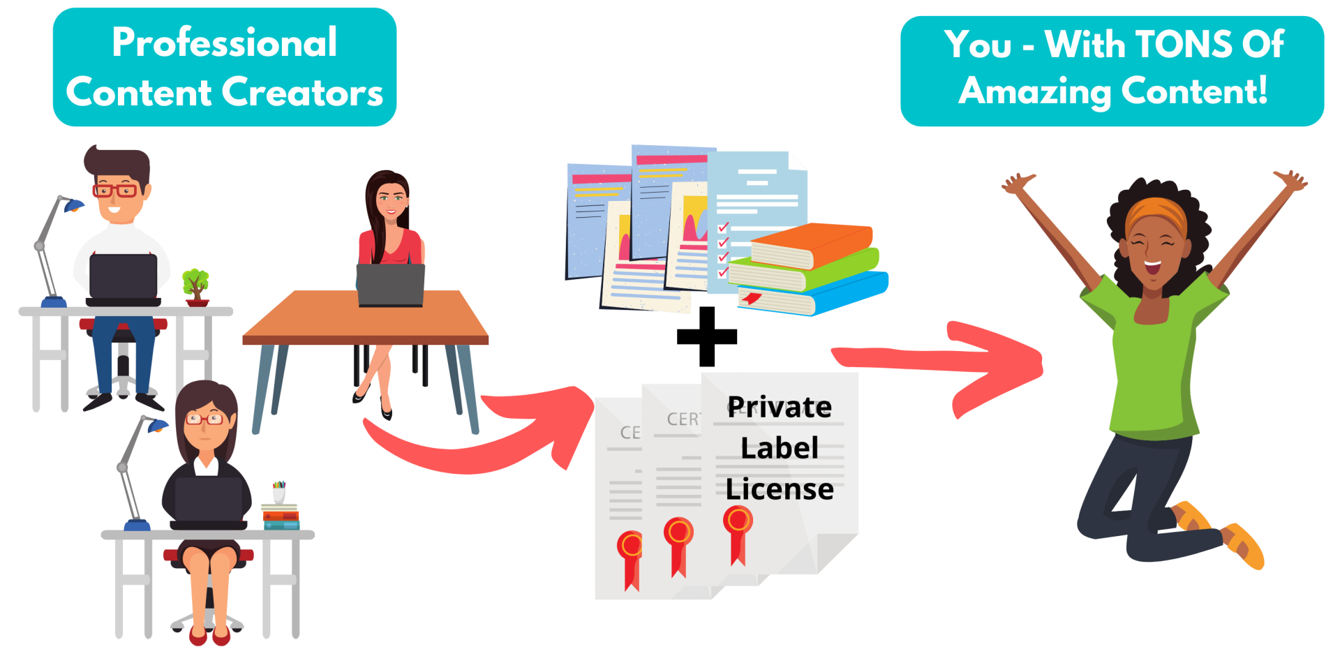Private Label Licensing lets you take a product (article, ebook, online course, etc...) that was created by someone else (Professional Content Creators in this case) and it allows you to put your own name as the creator of it, put your branding on it, use it completely as your own, and keep 100% of the profits...
